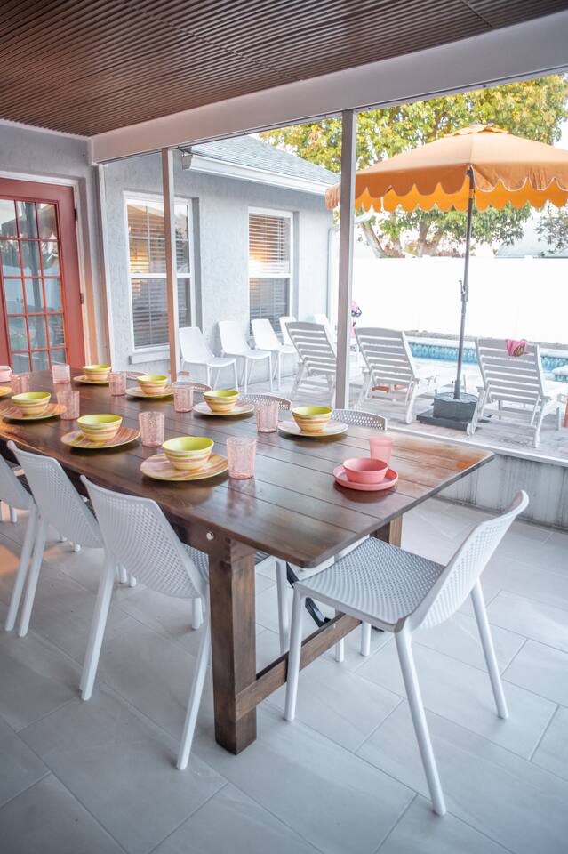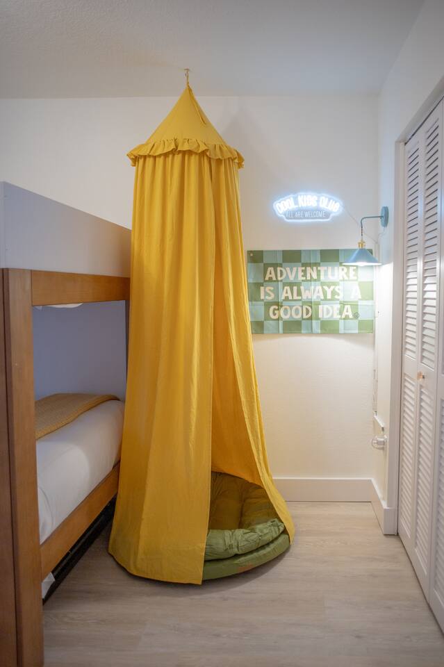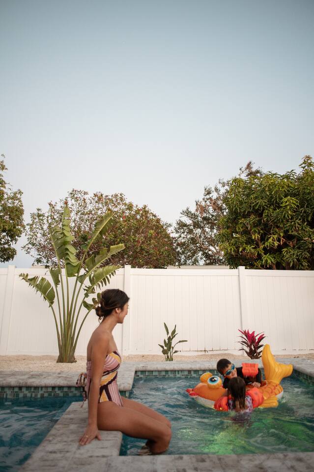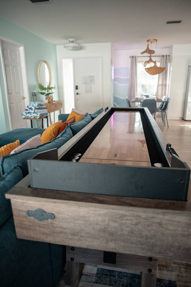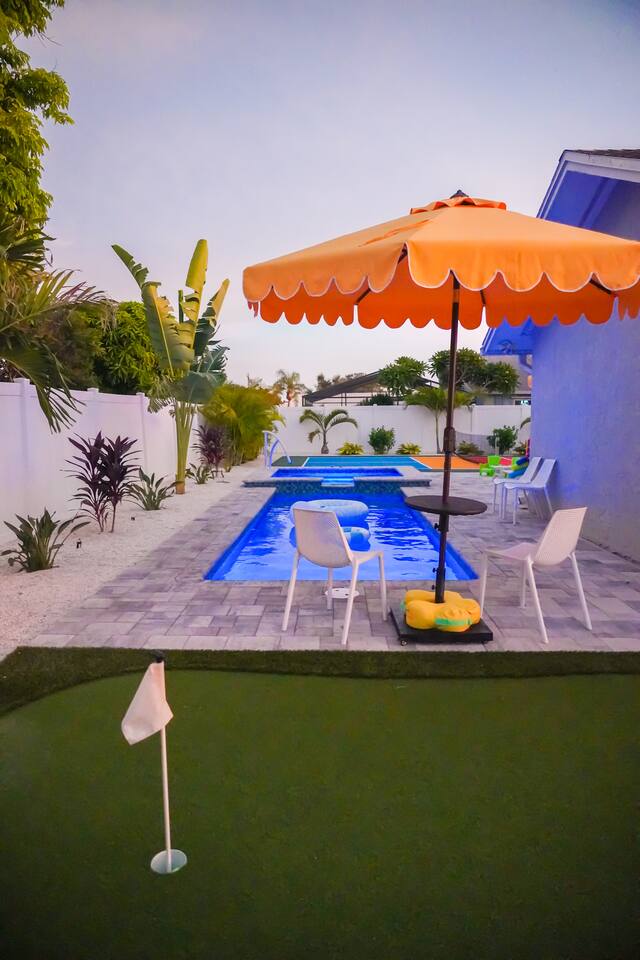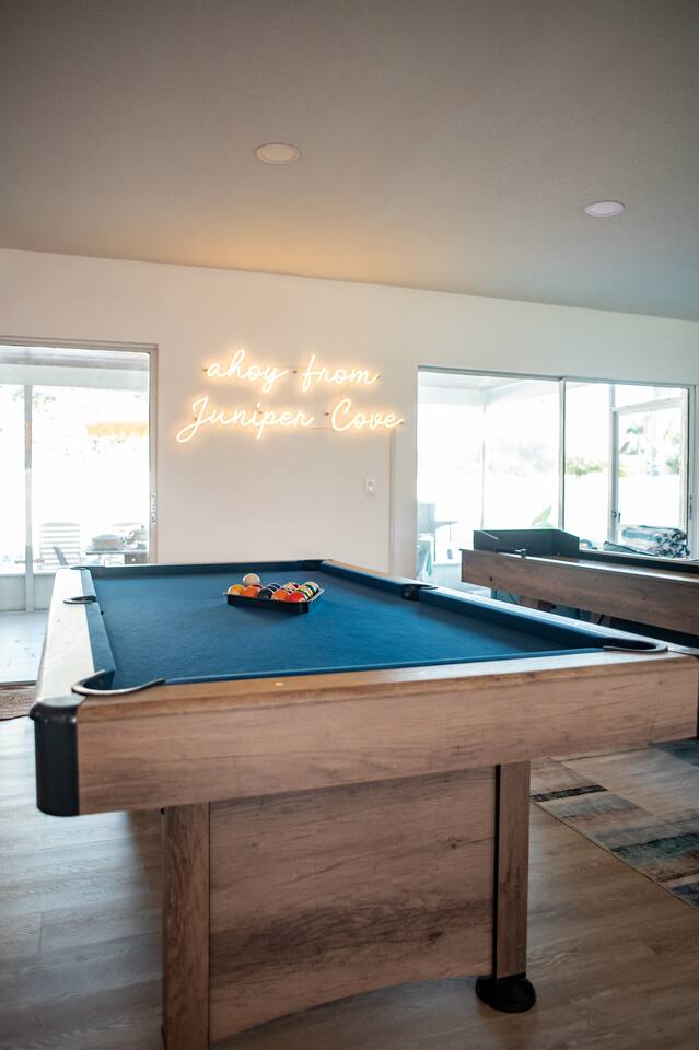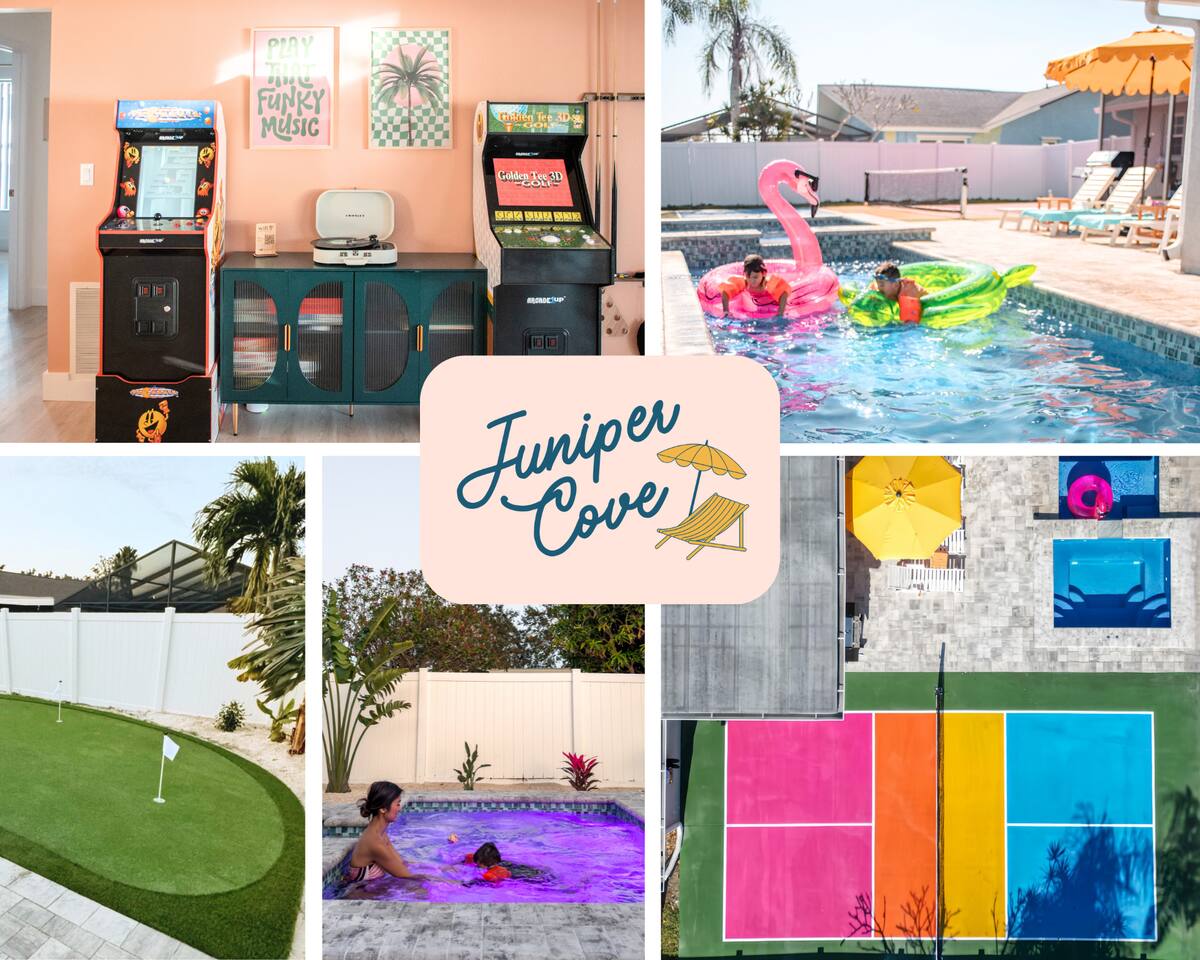 Welcome to Juniper Cove! 🌴 Trade snow boots for flip-flops at our newly renovated tropical retreat, just 10 minutes from the white-sand beaches of Anna Maria Island and IMG Academy. We created Juniper Cove as a warm winter haven – a place for loved ones to relax, connect, and escape the chill. Picture yourself soaking in the 87° heated saltwater pool, unwinding in the hot tub, rallying on the pickleball court, or sharing laughs over a game night in the lanai. At Juniper Cove, every detail is designed to keep you cozy, connected, and making unforgettable memories all winter long. 🛏️ Bedrooms & Bathrooms 🌴 Bedroom 1: King bed, ensuite bathroom, twin sleeper sofa (perfect for a child), and a work-from-home desk. 🌴 Bedroom 2: King bed, ensuite bathroom, and twin sleeper sofa. 🌴 Bedroom 3: King bed, next to a shared guest bathroom. 🌴 Bedroom 4: Full-over-full bunk beds, twin trundle, and a shared guest bathroom—a kid’s dream room! 🌴 Bathrooms: Three full bathrooms (two with walk-in showers, one with a shower/tub combo). ☀️ Backyard Bliss with pool/spa, pickleball, putt-putt, cornhole, and lounge area 🏓 Private Pickleball Court: One of our most-loved features, with paddles and balls included for casual or competitive matches. 🏊♂️ Heated Saltwater Pool: A 87° 9x24-foot swimming pool with a swim shelf and gradual depth up to 4'9". 🛁 Spillover Spa: A spacious 10x10 hot tub at 102° that comfortably seats eight for ultimate relaxation. ⛳ 4-hole Putting Green: Perfectly placed alongside the pool and pickleball court for fun backyard practice. 🌞 Poolside Lounge Chairs: Four comfortable loungers with a bright yellow umbrella for sunny or shaded relaxation. 🍴 Outdoor Gas BBQ Grill & Dining: Enjoy poolside meals or gather at the lanai’s table for 10 for alfresco feasts. 🎮 Entertainment for Everyone 🎱 Game Room: Features a pool table, shuffleboard, two arcade consoles, puzzles, and board games for all ages. 🎮 Xbox One Gaming Console: Includes a variety of games for downtime fun. 🏖️ Adventure & Gear 🌊 Beach Essentials: Chairs, beach towels, umbrellas, toys, a wagon, and a cooler to make your outings stress-free. 🎣 Fishing Rods: Surf and pier fishing gear is available in the garage for your Florida adventures. 🌺 Family-Friendly Touches 👶 Baby and Toddler Gear: Includes two pack-and-plays, a high chair, and kids’ dishware. 🛏️ Blackout Curtains, Sound Machines, and Baby Monitor: Help ensure restful sleep for little ones. 📚 Books, Toys, and Reading Nook: Keep kids entertained throughout your stay. 🛒 Stroller and Wagon: Make outings with young children easy and enjoyable. 📍 Nearby Attractions 🏖️ Anna Maria Island Beaches: Just 10 minutes away, along with Robinson Preserve and IMG Academy. 🌳 Bradenton Riverwalk and Cortez Fishing Village: Only 15 minutes from the house. ⚽ Premier Sports Campus: A short 30-minute drive. ✈️ Sarasota Airport: Just 20 minutes away, with Tampa Airport about an hour from Juniper Cove. 🛍️ Thoughtful Extras Included 🧻 Starter Supplies: Paper products, Keurig coffee pods, tea bags, dish soap, and dishwasher pods. 🍳 Fully Stocked Kitchen: Equipped with a Keurig Duo, air fryer, Crockpot, blender, and more. 📺 WiFi & Smart TVs: Fast WiFi and Smart TVs in every room keep you connected and entertained. 🧺 Washer and Dryer: Includes detergent for your convenience. 🧘 Yoga Mats: Perfect for stretching or light exercise by the pool. 🌞 Make Memories Together ✨ Juniper Cove: Your destination for relaxation, fun, and connection. Play pickleball, lounge by the pool, or enjoy game nights in the game room. We can’t wait to host you at our little slice of paradise!
