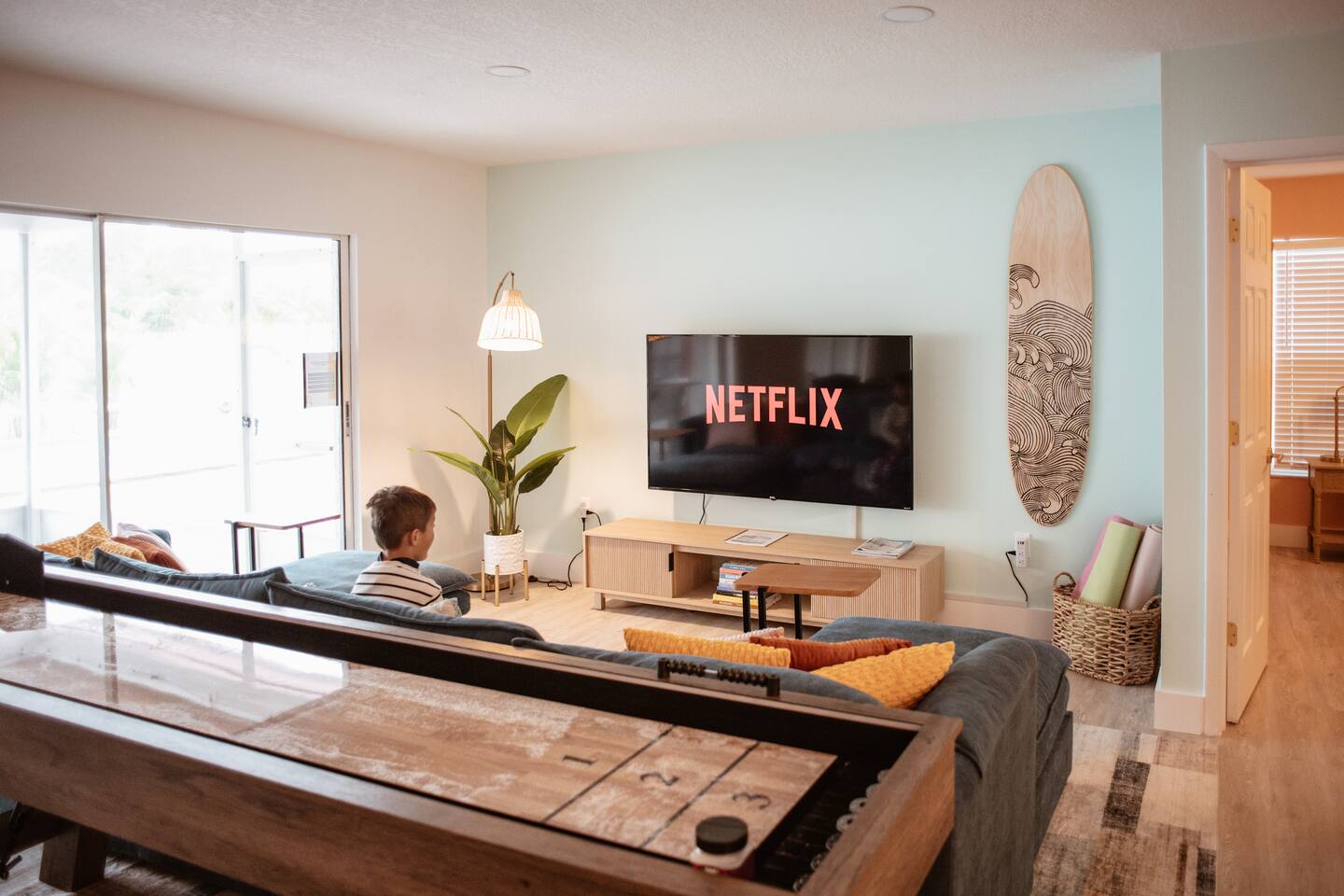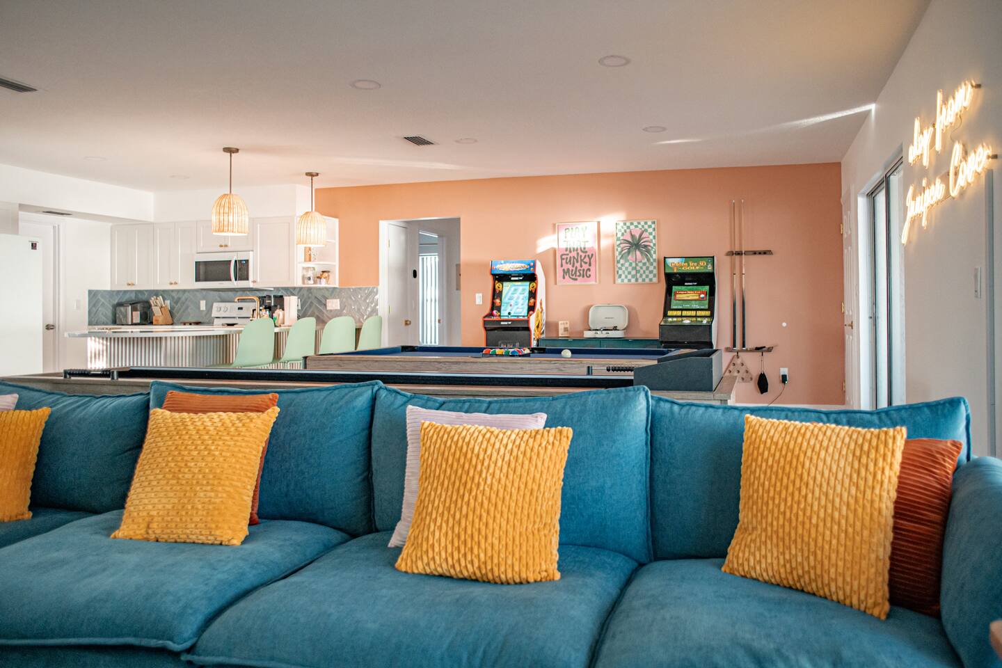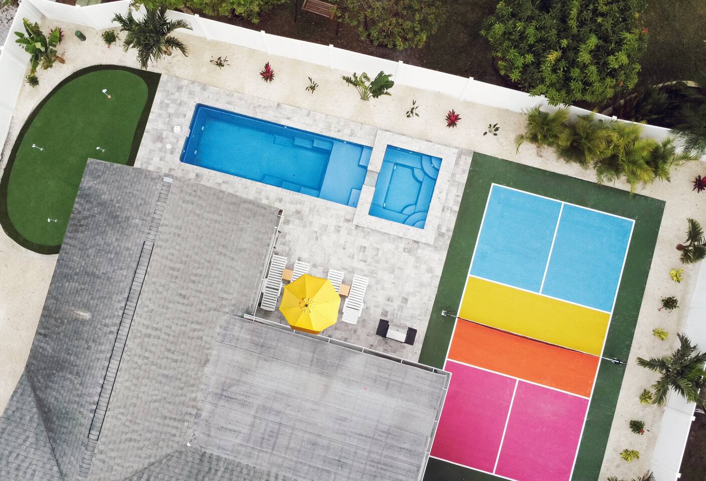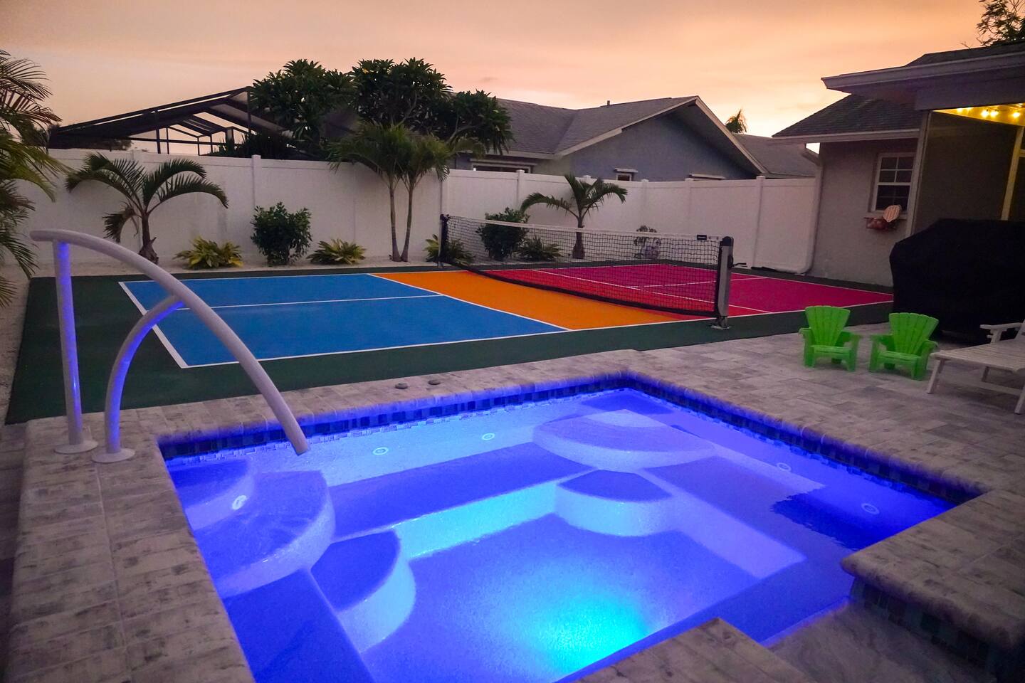 Welcome to Juniper Cove! 🌴 Trade snow boots for flip-flops at our newly renovated tropical retreat, just 10 minutes from the white-sand beaches of Anna Maria Island and IMG Academy. We created Juniper Cove as a warm winter haven – a place for loved ones to relax, connect, and escape the chill. Picture yourself soaking in the 87° heated saltwater pool, unwinding in the hot tub, rallying on the pickleball court, or sharing laughs over a game night in the lanai. At Juniper Cove, every detail is designed to keep you cozy, connected, and making unforgettable memories all winter long. 🛏️ Bedrooms & Bathrooms 🌴 Bedroom 1: King bed, ensuite bathroom, twin sleeper sofa (perfect for a child), and a work-from-home desk. 🌴 Bedroom 2: King bed, ensuite bathroom, and twin sleeper sofa. 🌴 Bedroom 3: King bed, next to a shared guest bathroom. 🌴 Bedroom 4: Full-over-full bunk beds, twin trundle, and a shared guest bathroom—a kid’s dream room! 🌴 Bathrooms: Three full bathrooms (two with walk-in showers, one with a shower/tub combo). ☀️ Backyard Bliss with pool/spa, pickleball, putt-putt, cornhole, and lounge area 🏓 Private Pickleball Court: One of our most-loved features, with paddles and balls included for casual or competitive matches. 🏊♂️ Heated Saltwater Pool: A 87° 9x24-foot swimming pool with a swim shelf and gradual depth up to 4'9". 🛁 Spillover Spa: A spacious 10x10 hot tub at 102° that comfortably seats eight for ultimate relaxation. ⛳ 4-hole Putting Green: Perfectly placed alongside the pool and pickleball court for fun backyard practice. 🌞 Poolside Lounge Chairs: Four comfortable loungers with a bright yellow umbrella for sunny or shaded relaxation. 🍴 Outdoor Gas BBQ Grill & Dining: Enjoy poolside meals or gather at the lanai’s table for 10 for alfresco feasts. 🎮 Entertainment for Everyone 🎱 Game Room: Features a pool table, shuffleboard, two arcade consoles, puzzles, and board games for all ages. 🎮 Xbox One Gaming Console: Includes a variety of games for downtime fun. 🏖️ Adventure & Gear 🌊 Beach Essentials: Chairs, beach towels, umbrellas, toys, a wagon, and a cooler to make your outings stress-free. 🎣 Fishing Rods: Surf and pier fishing gear is available in the garage for your Florida adventures. 🌺 Family-Friendly Touches 👶 Baby and Toddler Gear: Includes two pack-and-plays, a high chair, and kids’ dishware. 🛏️ Blackout Curtains, Sound Machines, and Baby Monitor: Help ensure restful sleep for little ones. 📚 Books, Toys, and Reading Nook: Keep kids entertained throughout your stay. 🛒 Stroller and Wagon: Make outings with young children easy and enjoyable. 📍 Nearby Attractions 🏖️ Anna Maria Island Beaches: Just 10 minutes away, along with Robinson Preserve and IMG Academy. 🌳 Bradenton Riverwalk and Cortez Fishing Village: Only 15 minutes from the house. ⚽ Premier Sports Campus: A short 30-minute drive. ✈️ Sarasota Airport: Just 20 minutes away, with Tampa Airport about an hour from Juniper Cove. 🛍️ Thoughtful Extras Included 🧻 Starter Supplies: Paper products, Keurig coffee pods, tea bags, dish soap, and dishwasher pods. 🍳 Fully Stocked Kitchen: Equipped with a Keurig Duo, air fryer, Crockpot, blender, and more. 📺 WiFi & Smart TVs: Fast WiFi and Smart TVs in every room keep you connected and entertained. 🧺 Washer and Dryer: Includes detergent for your convenience. 🧘 Yoga Mats: Perfect for stretching or light exercise by the pool. 🌞 Make Memories Together ✨ Juniper Cove: Your destination for relaxation, fun, and connection. Play pickleball, lounge by the pool, or enjoy game nights in the game room. We can’t wait to host you at our little slice of paradise!